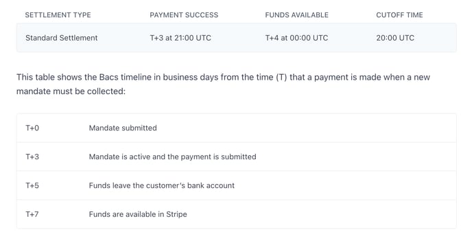 The following table describes the settlement timings for BACS Direct Debit payments that Stripe offers. All timestamps are in UTC.