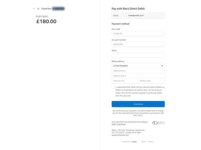 Step 4: At this point, the Stripe Checkout screen will load, showing the amount and the customer's email address pre-filled. Enter your customer's payment method details such as the Sort Code, Bank Account Number, Full Name and Billing Address. Read out the customer declaration and tick the box before clicking on the blue 'Continue' button.